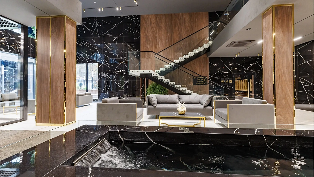 В лобби и лестничных пролетах используется керамогранит Ametis by Estima, коллекция Суприм под мрамор. Износостойкость и устойчивость к скольжению делают его идеальным выбором для общественных пространств с высокой нагрузкой.