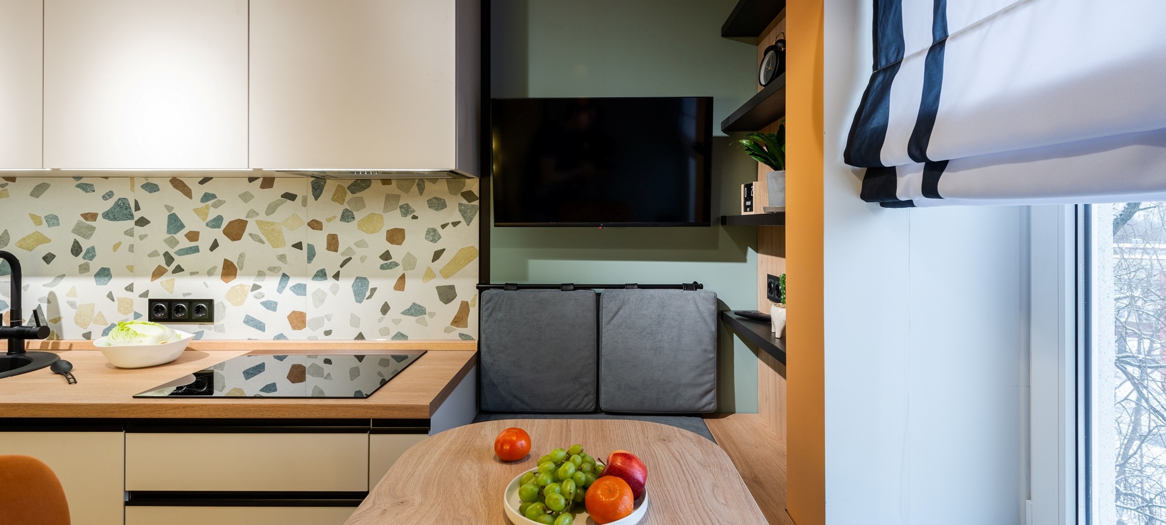 Яркие и насыщенные оттенки плитки стали акцентом, который не только освежил интерьер, но и сделал пространство более уютным и функциональным. Получилась стильная кухня, идеально подходящая для совместного приготовления еды и семейных ужинов.