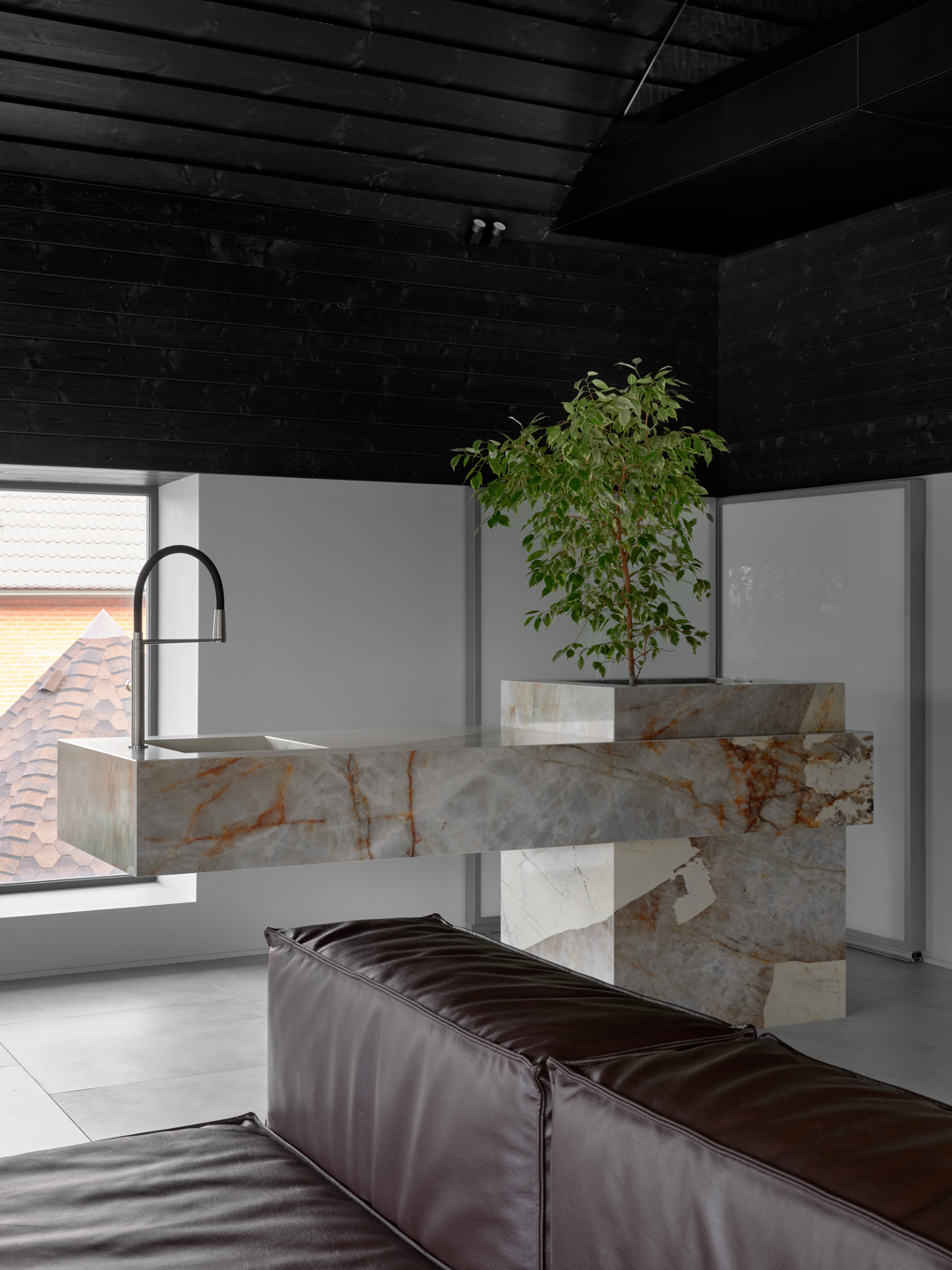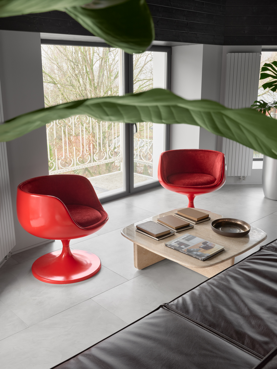 Пол из коллекции Граффито формирует чистую, спокойную плоскость, подчёркивая текстуры дерева, кожи и яркого камня. Матовая поверхность поддерживает современную геометрию и визуальный баланс пространства.