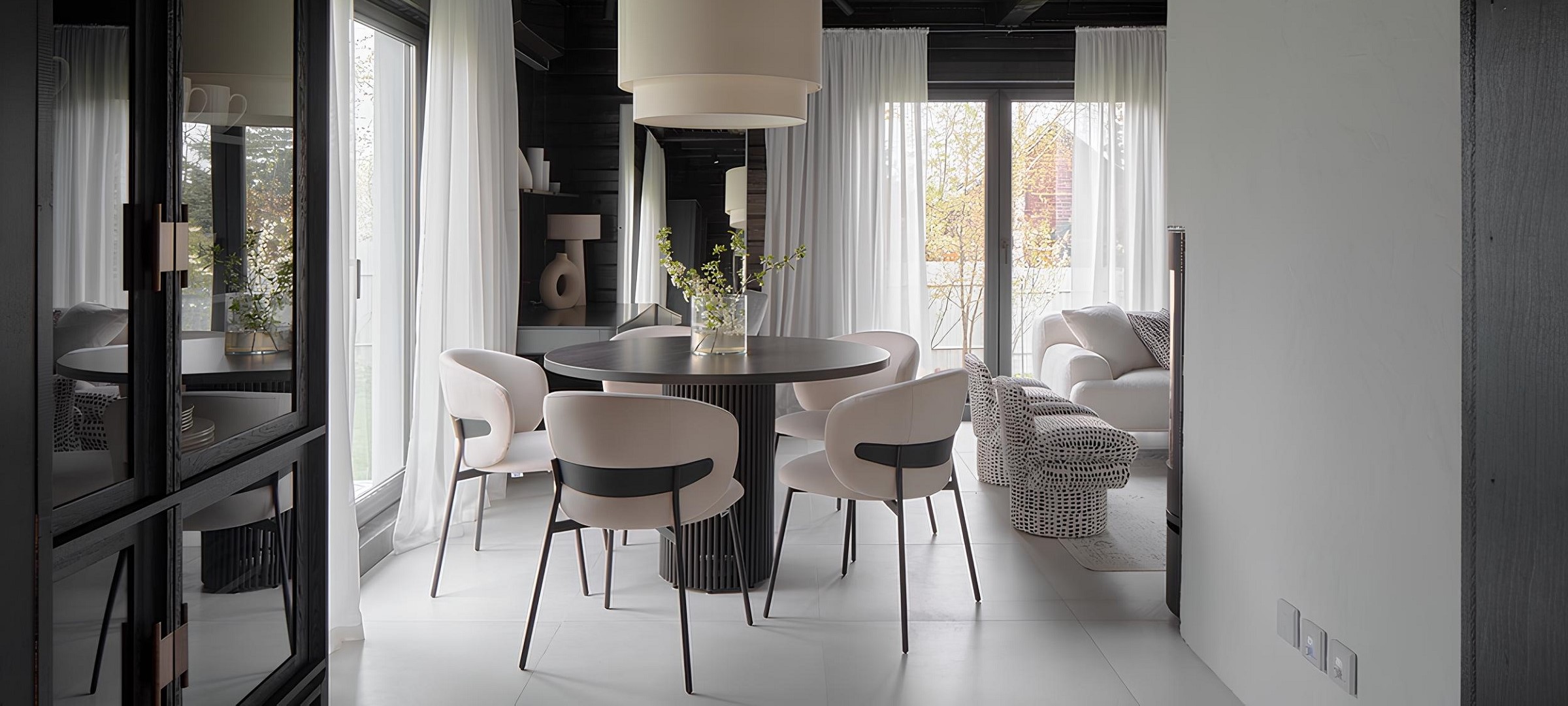 Этот материал не только стильно выглядит, но и очень практичен для загородного дома: устойчив к износу, легок в уходе и прекрасно сохраняет свой вид долгие годы. Такое покрытие стало отличным фоном для деревянных элементов, мягкой мебели и ярких акцентов, которые добавили индивидуальности и уюта.